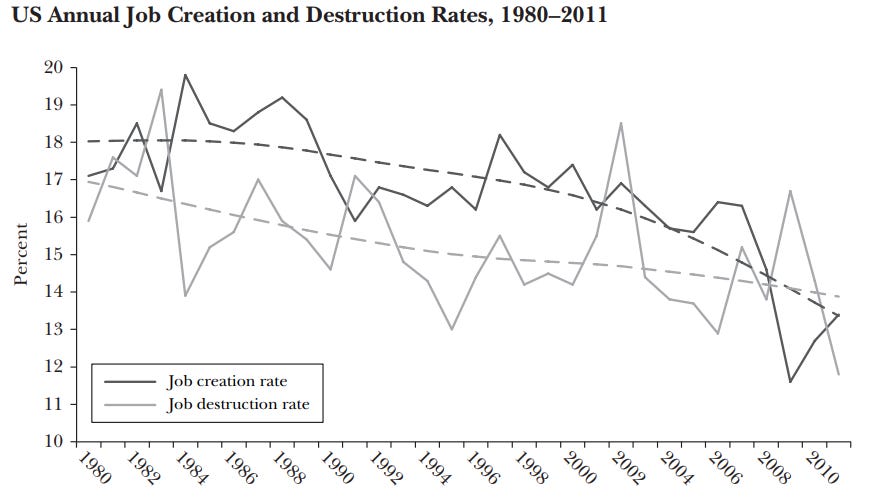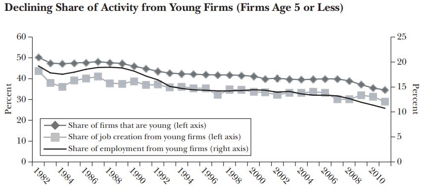 I don’t have data to extend the figure to earlier time periods, but from other data on new company creation per decade I strongly suspect the figure above would show this decline began at least 1 or 2 decades earlier, probably once the wave of activity from the post-WWII GI Bill had finished fully washing through the economic system.