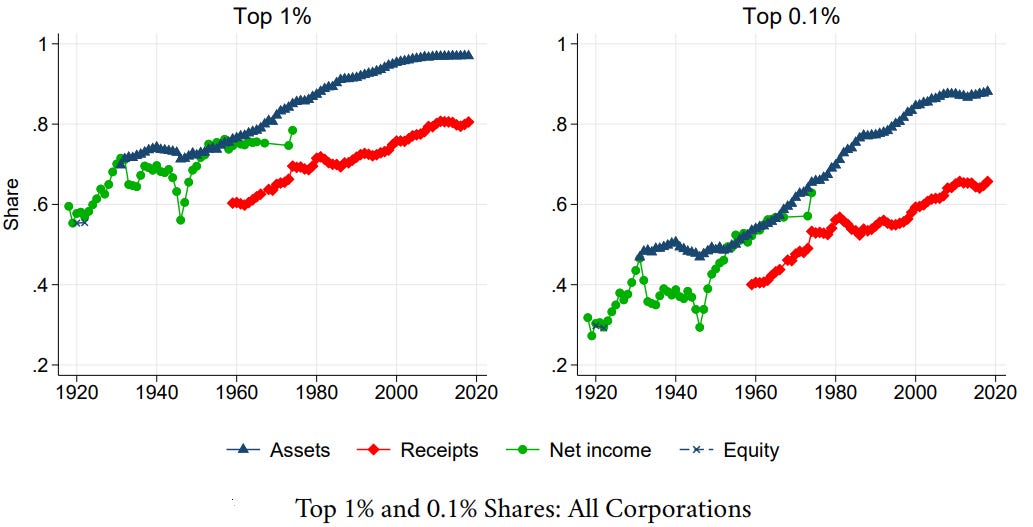 By 2020 the top 0.1% largest had about a 86% share. That represents roughly the top 5000 largest corporations from about 1990 onwards, and fewer than 5000 in the years prior due to changes in the number of U.S. businesses over time.