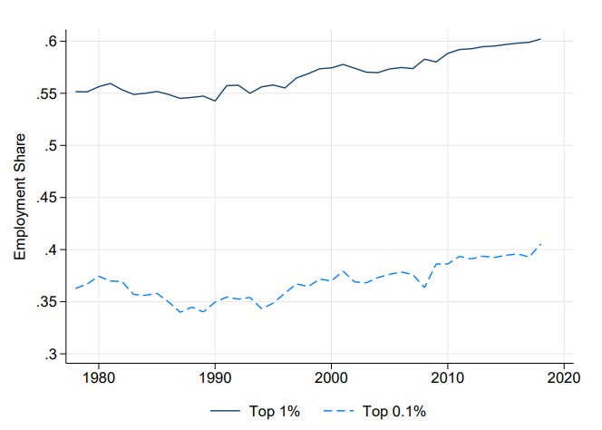 Unfortunately we’re only seeing data from 1980 onwards so commenting on long-term trend is probably not warranted, but the percentage shares do matter. The top 0.1% of companies that control 86% share of assets only employ a 41% share of the workforce; the top 1% with a 97% share of assets employ a 60% share of the workforce. That means the mere fact of businesses getting more concentrated has not generated direct employment in equal scale with their size. They’ll employ more people, but not 1-for-1 with net increases in financial concentration. Smaller companies are the ones picking up the slack in employment.