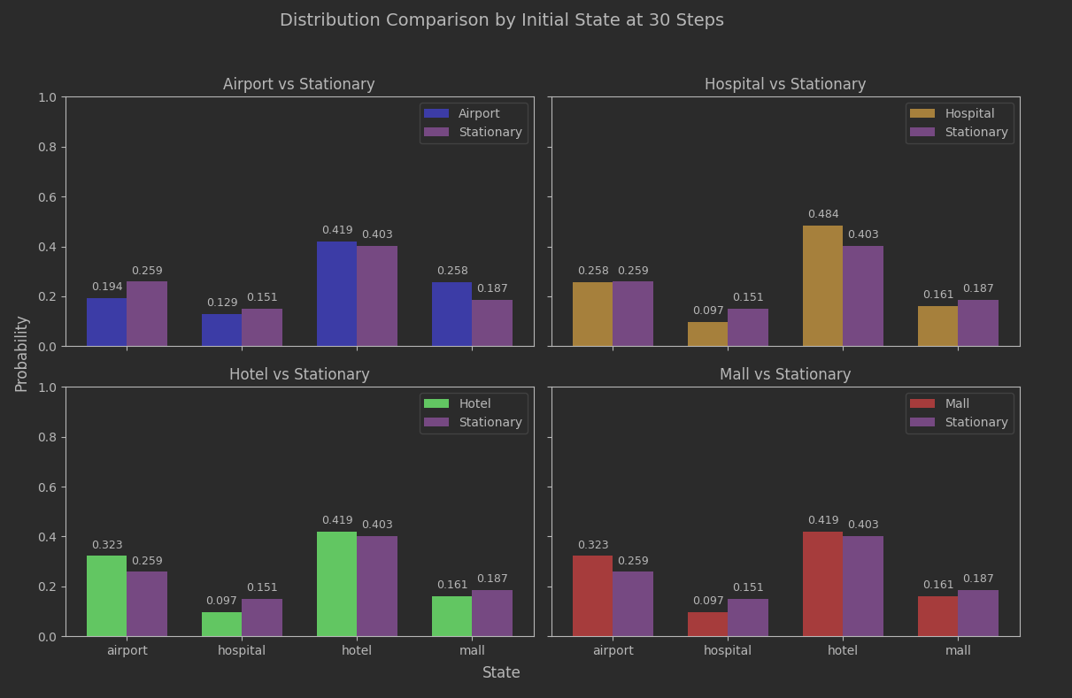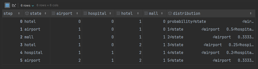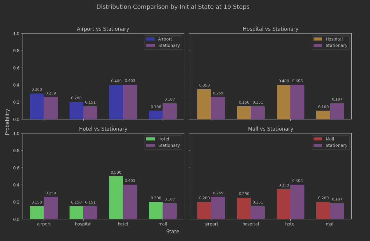 Notice how at at the start (step 0), where all we have is the initial state, the two initial states that are closest to the stationary distribution are 'hotel'
