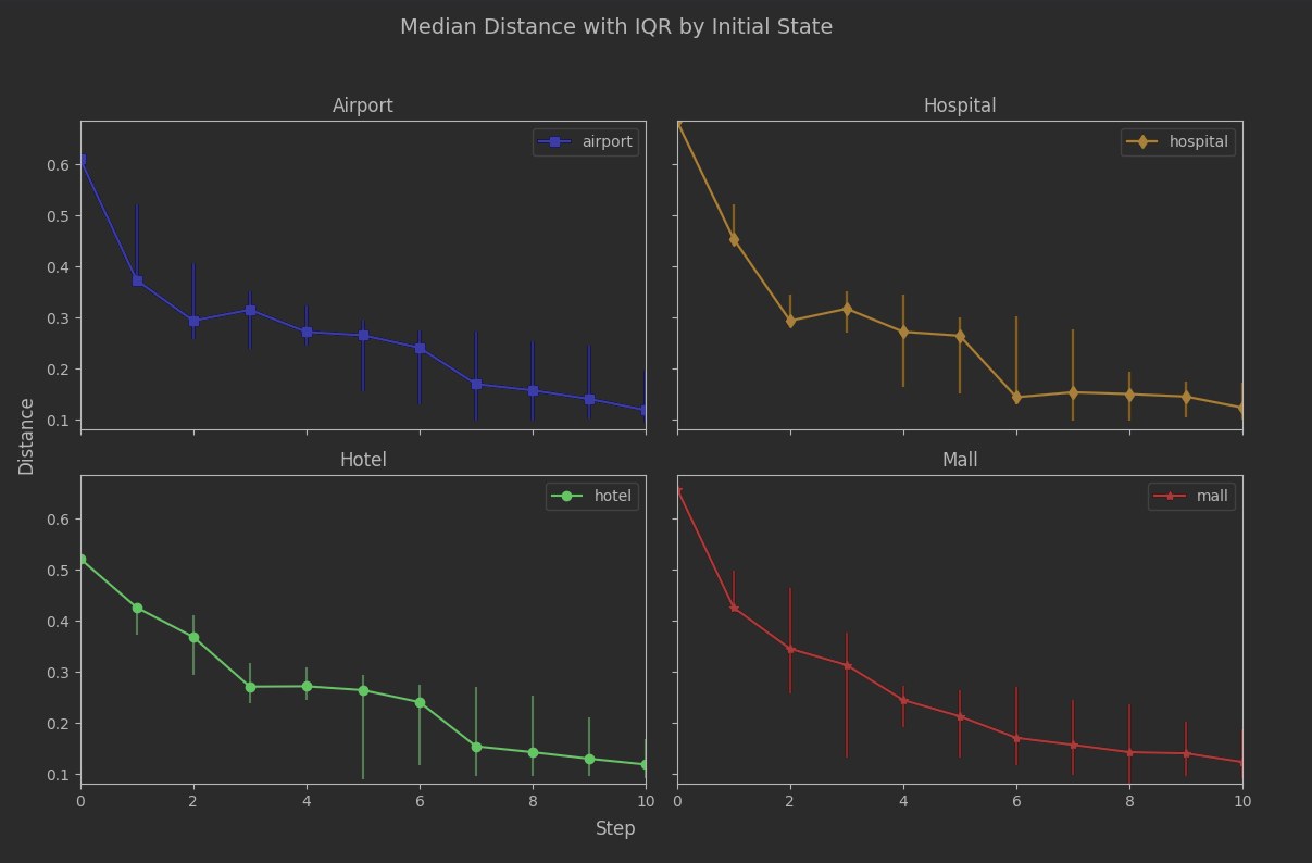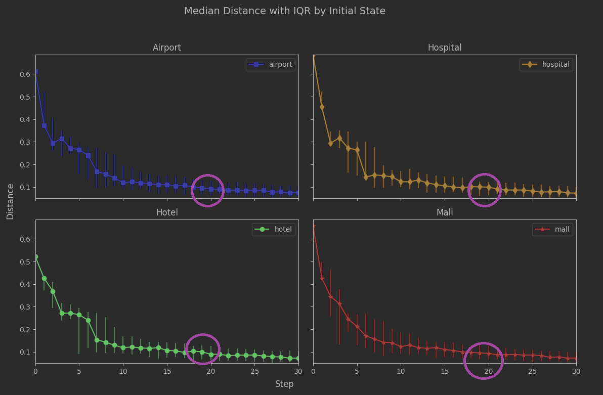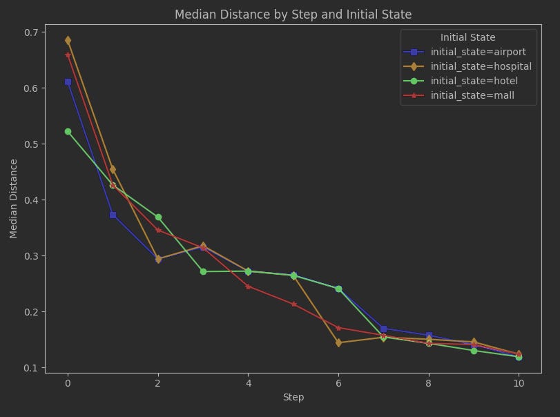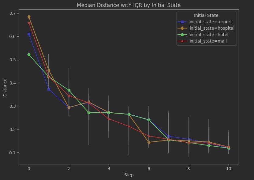 As the run progresses, the median outcomes for each initial state converge, and by step 7 we’re seeing they don’t differ much from each other. The rest of the run going forward won’t likely be about specific initial states, but just the overall challenge of any state to result in data that closely approximates the stationary distribution.