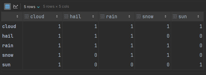 This data restricts sun to not spontaneously transitioning to hail or snow or rain. We would need a walk of length at least 2 to have a chance to transition through cloudy weather first. We can accomplish that with matrix multiplication as a “dot” product: