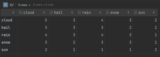 We can see, correctly, that there is only 1 walk of length 2 that starts with sun and ends with snow.