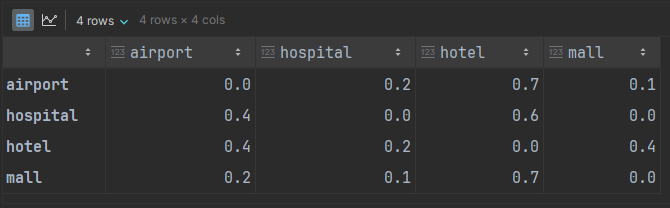 Let’s try this for the taxi DTFMC defined earlier. The Pandas DataFrame for that adjacency matrix is: