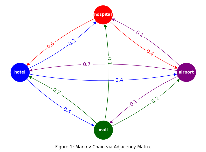 Now we have a visualization of a Markov Chain. From any state (node), in one discrete time step travel will happen on one of the correspondingly-colored outedges to a target node, with probability of that event as shown by the weight on the edge.