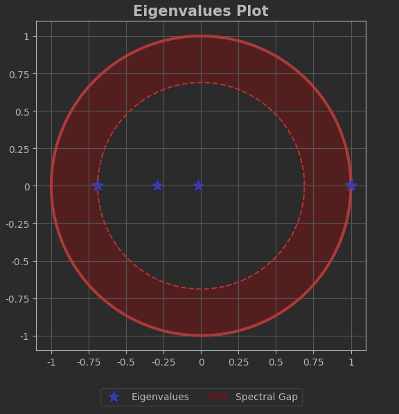 Take notice of the two largest-magnitude eigenvalues. The wide red ring shows the distance between them, called the spectral gap. The closer they are, the more difficult it is for the future probabilities to generate walk that converge to the stationary distribution.